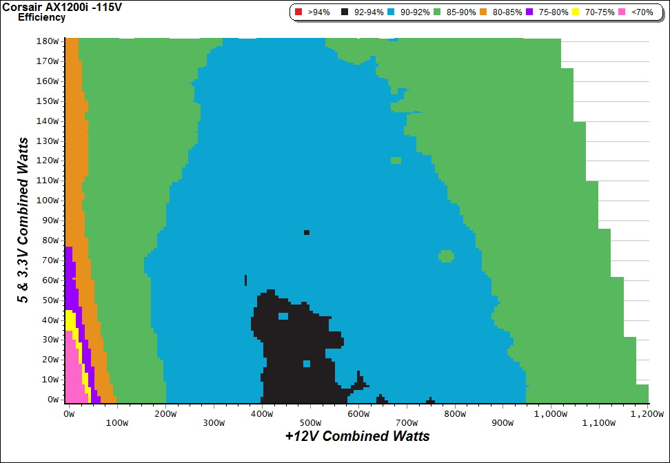 This graph depicts the PSU`s efficiency throughout its entire operational range. For the generation of the efficiency and noise graphs we set our loaders to auto mode through our custom-made software before trying thousands of possible load combinations.
