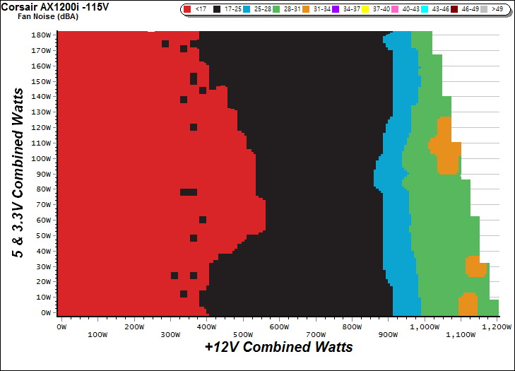 The PSU`s noise in its entire operational range and under 30-32 °C ambient is depicted in this graph. The X axis represents the load on the +12V rail(s) while the Y axis is the load on the minor rails.