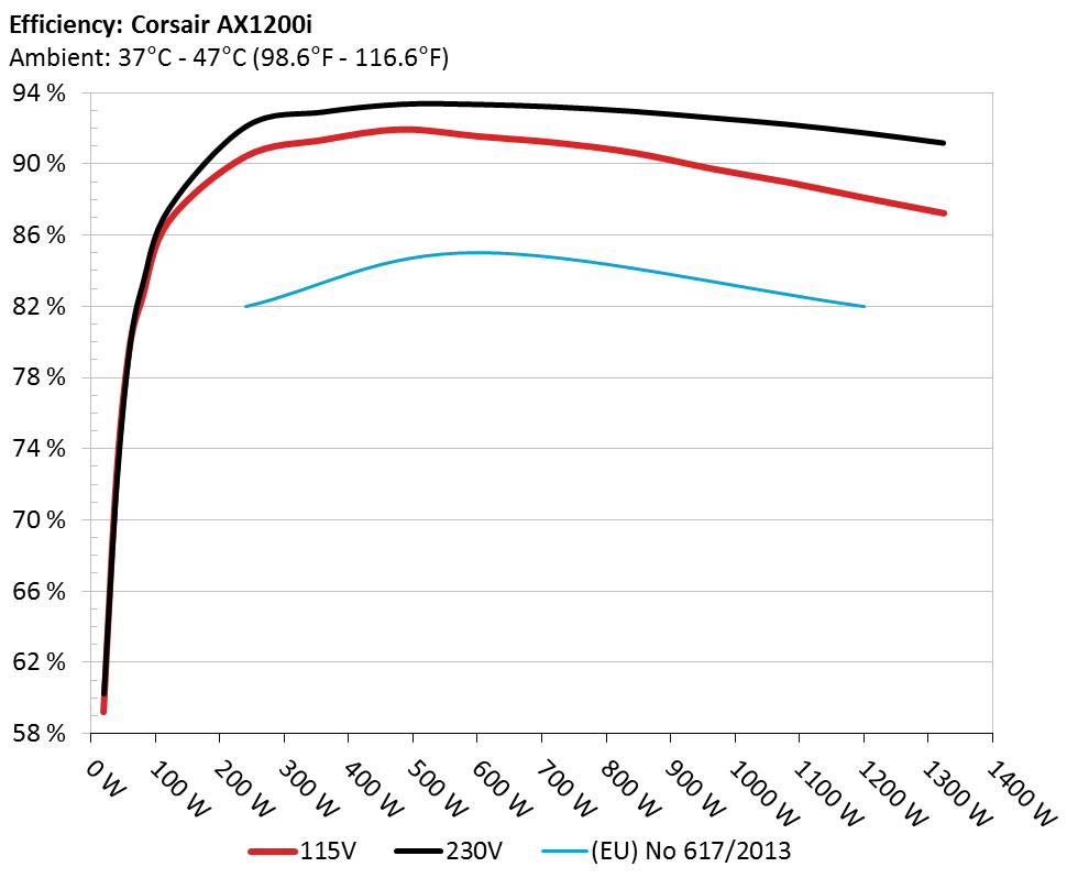 The PSU`s efficiency under high ambient temperatures with 115V and 230V input. For this graph the results of the 10-110% load regulation table are used.