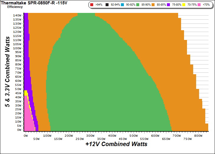 This graph depicts the PSU`s efficiency throughout its entire operational range. For the generation of the efficiency and noise graphs we set our loaders to auto mode through our custom-made software before trying thousands of possible load combinations.