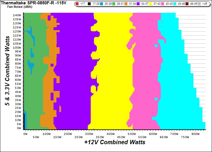 The PSU`s noise in its entire operational range and under 30-32 °C ambient is depicted in this graph. The X axis represents the load on the +12V rail(s) while the Y axis is the load on the minor rails.