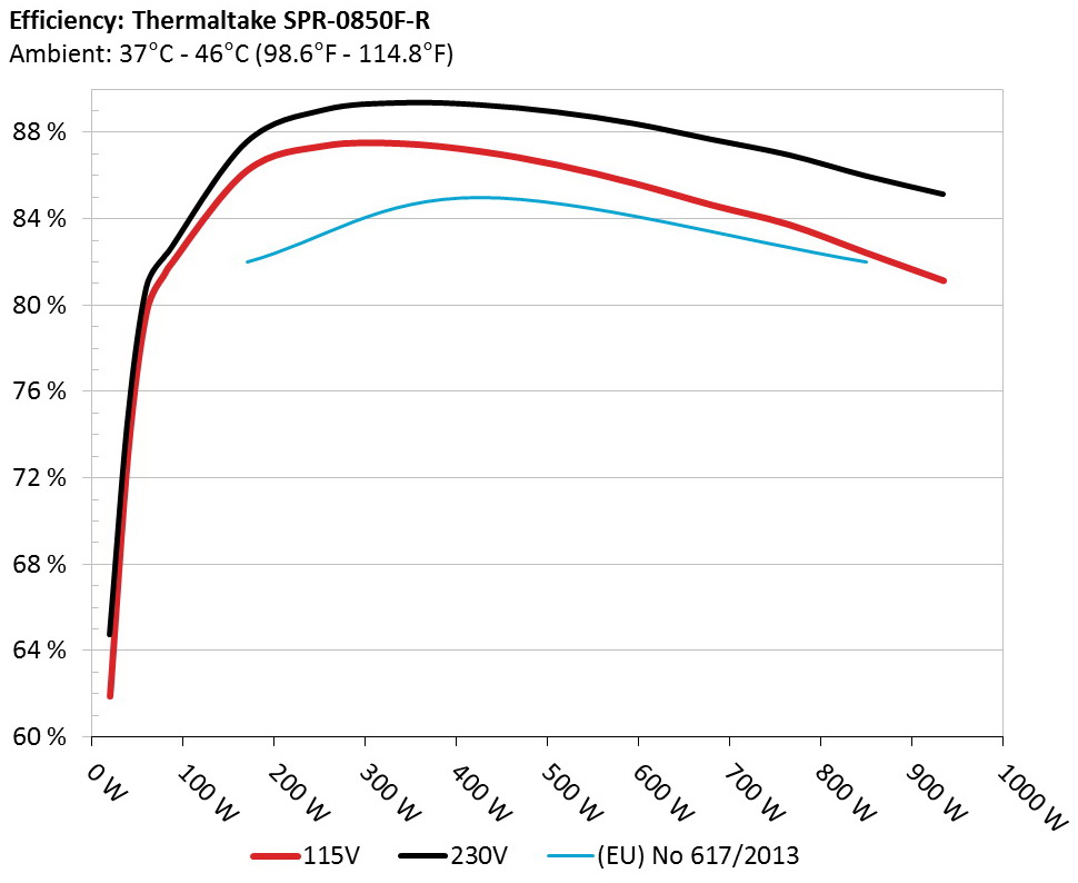 The PSU`s efficiency under high ambient temperatures with 115V and 230V input. For this graph the results of the 10-110% load regulation table are used.