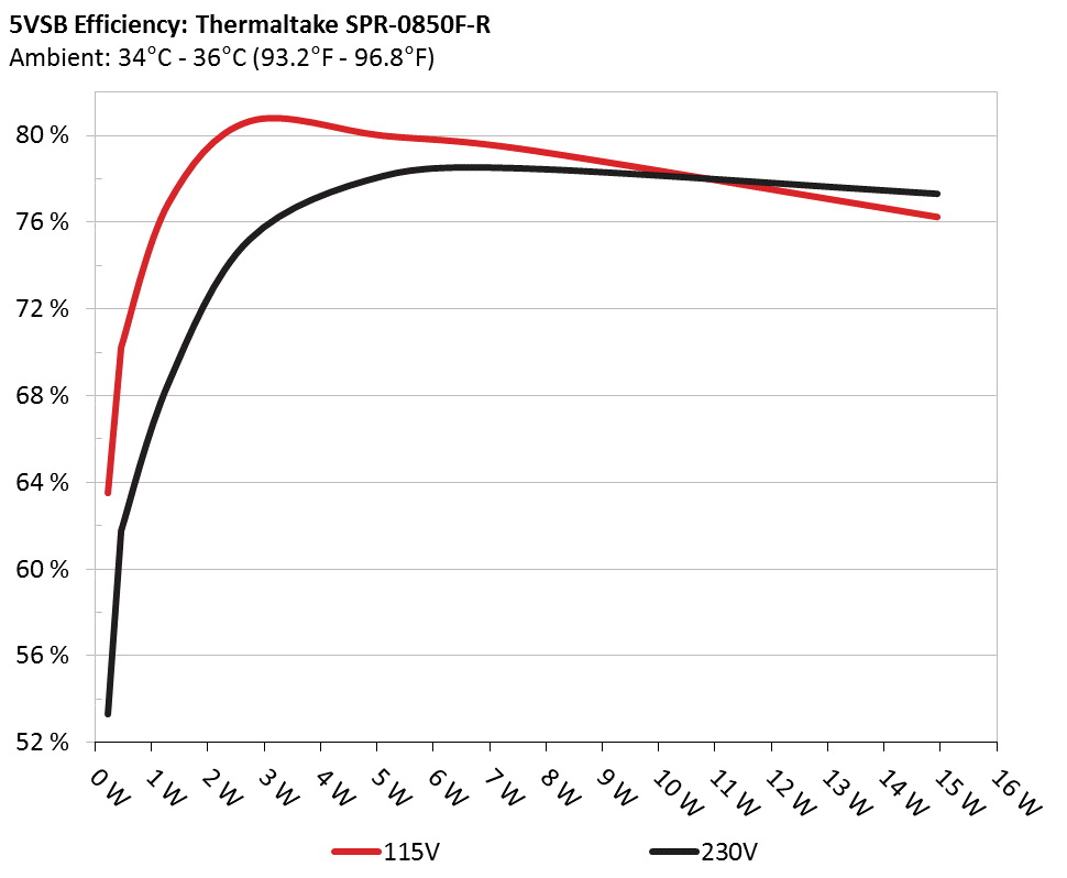 This graph depicts the efficiency levels of the 5VSB rail with 115V and 230V input.