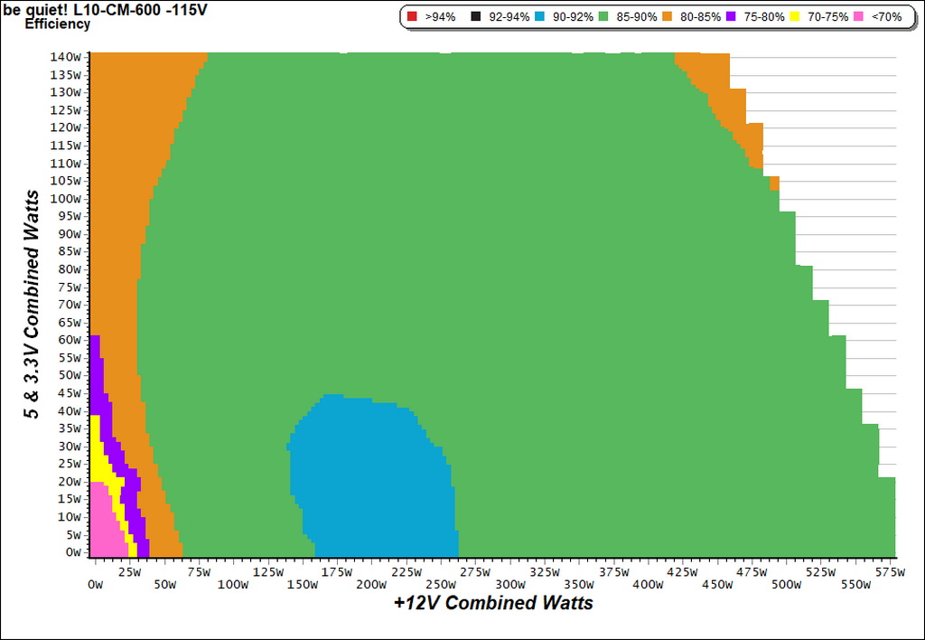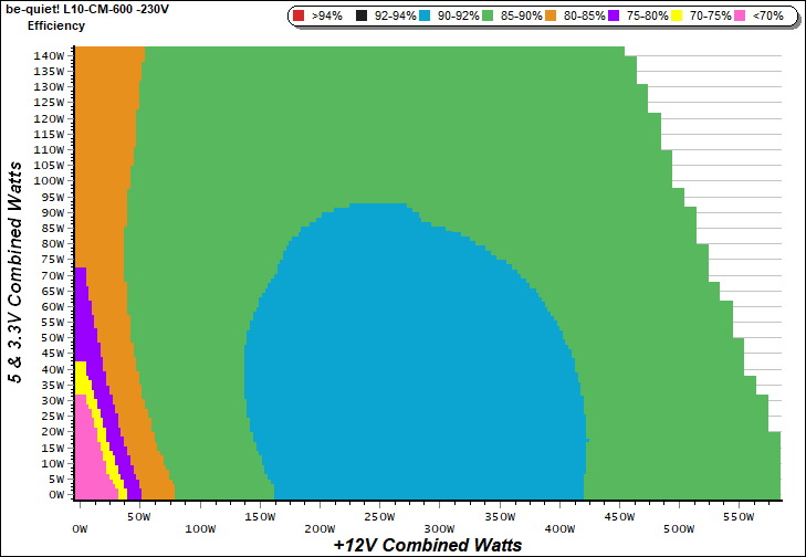 This graph depicts the PSU`s efficiency throughout its entire operational range. For the generation of the efficiency and noise graphs we set our loaders to auto mode through our custom-made software before trying thousands of possible load combinations.