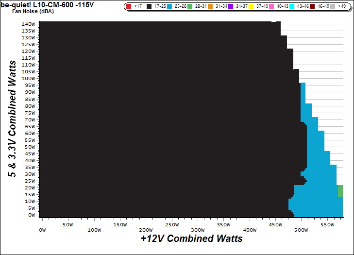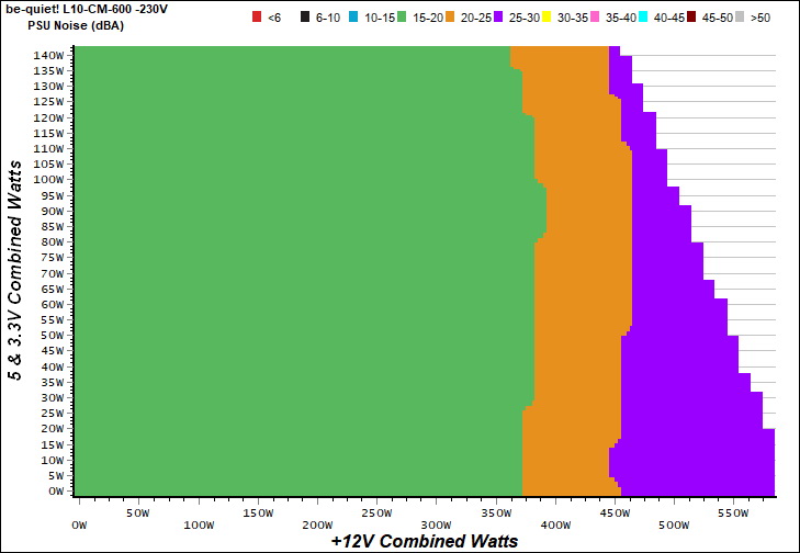 The PSU`s noise in its entire operational range and under 30-32 °C ambient is depicted in this graph. The X axis represents the load on the +12V rail(s) while the Y axis is the load on the minor rails.