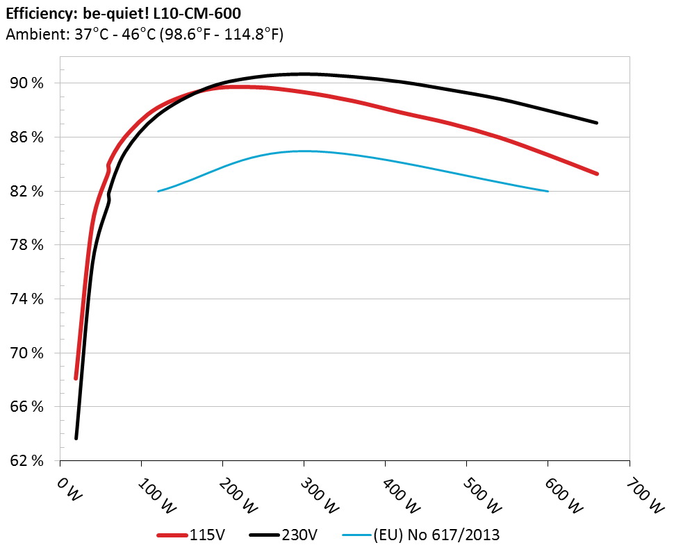 The PSU`s efficiency under high ambient temperatures with 115V and 230V input. For this graph the results of the 10-110% load regulation table are used.