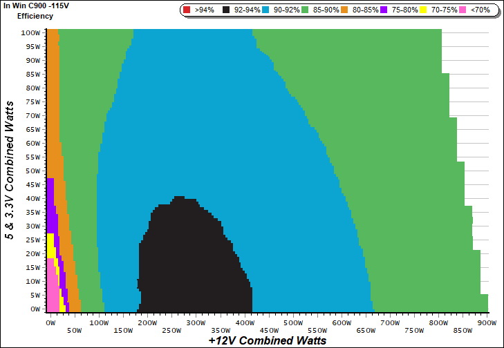 This graph depicts the PSU`s efficiency throughout its entire operational range. For the generation of the efficiency and noise graphs we set our loaders to auto mode through our custom-made software before trying thousands of possible load combinations.