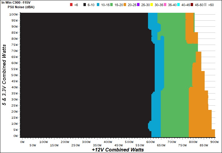 The PSU`s noise in its entire operational range and under 30-32 °C ambient is depicted in this graph. The X axis represents the load on the +12V rail(s) while the Y axis is the load on the minor rails.