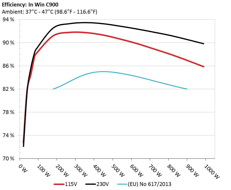 The PSU`s efficiency under high ambient temperatures with 115V and 230V input. For this graph the results of the 10-110% load regulation table are used.