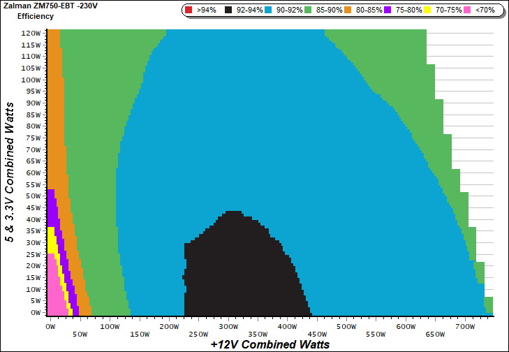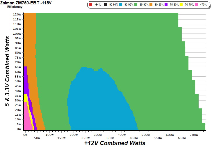 This graph depicts the PSU`s efficiency throughout its entire operational range. For the generation of the efficiency and noise graphs we set our loaders to auto mode through our custom-made software before trying thousands of possible load combinations.