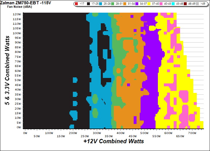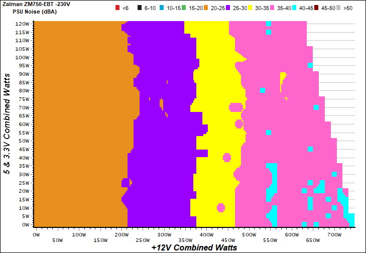The PSU`s noise in its entire operational range and under 30-32 °C ambient is depicted in this graph. The X axis represents the load on the +12V rail(s) while the Y axis is the load on the minor rails.