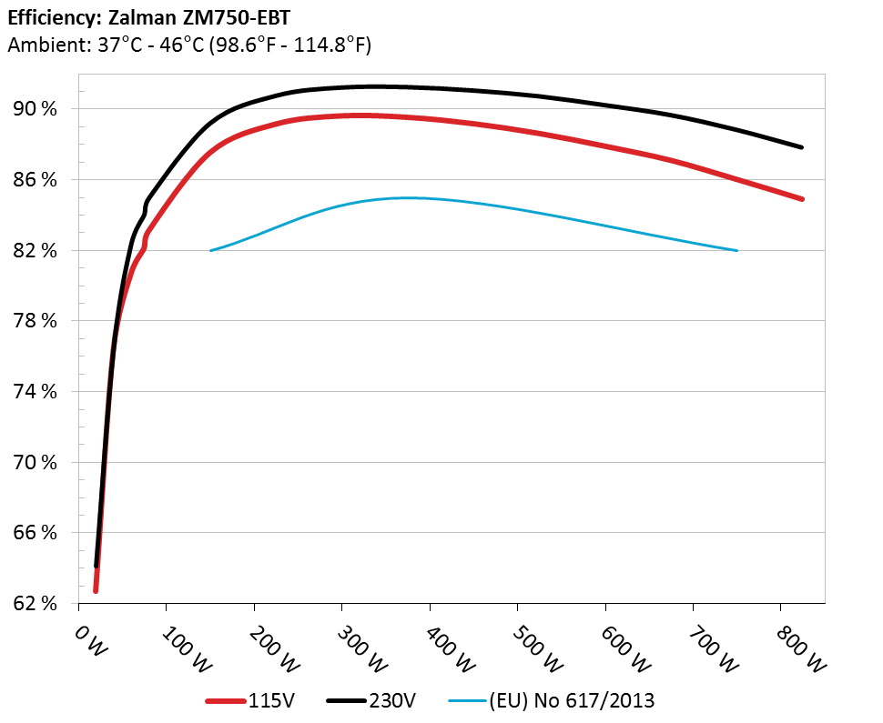 The PSU`s efficiency under high ambient temperatures with 115V and 230V input. For this graph the results of the 10-110% load regulation table are used.