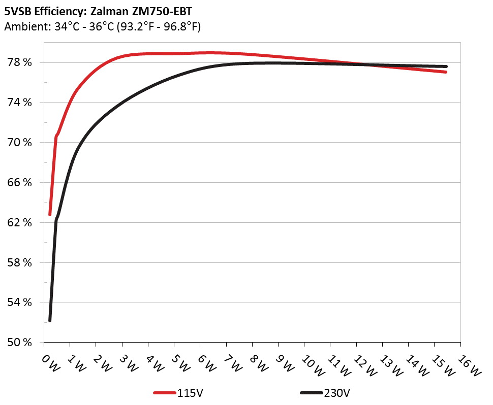 This graph depicts the efficiency levels of the 5VSB rail with 115V and 230V input.
