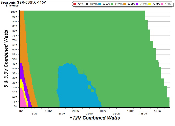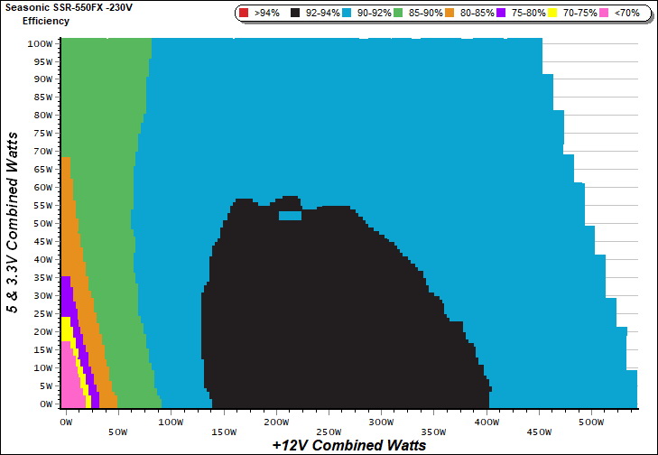 This graph depicts the PSU`s efficiency throughout its entire operational range. For the generation of the efficiency and noise graphs we set our loaders to auto mode through our custom-made software before trying thousands of possible load combinations.