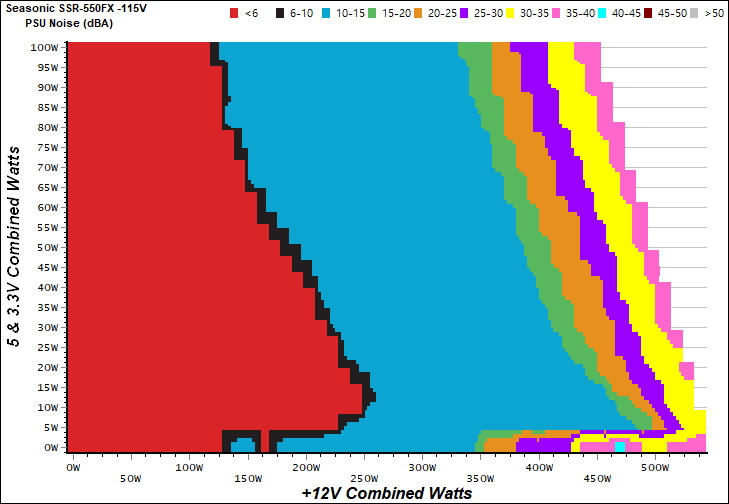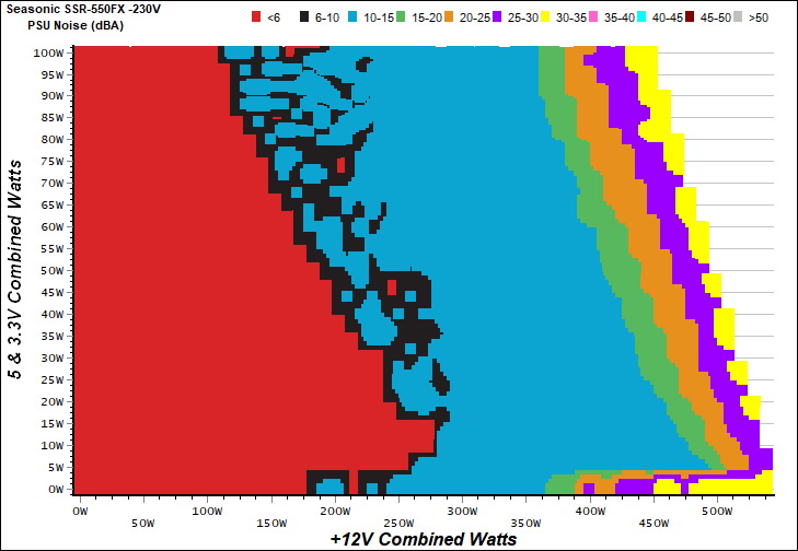 The PSU`s noise in its entire operational range and under 30-32 °C ambient is depicted in this graph. The X axis represents the load on the +12V rail(s) while the Y axis is the load on the minor rails.