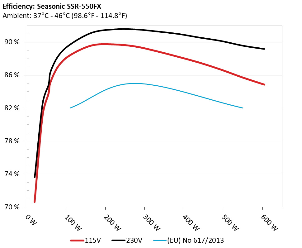 The PSU`s efficiency under high ambient temperatures with 115V and 230V input. For this graph the results of the 10-110% load regulation table are used.