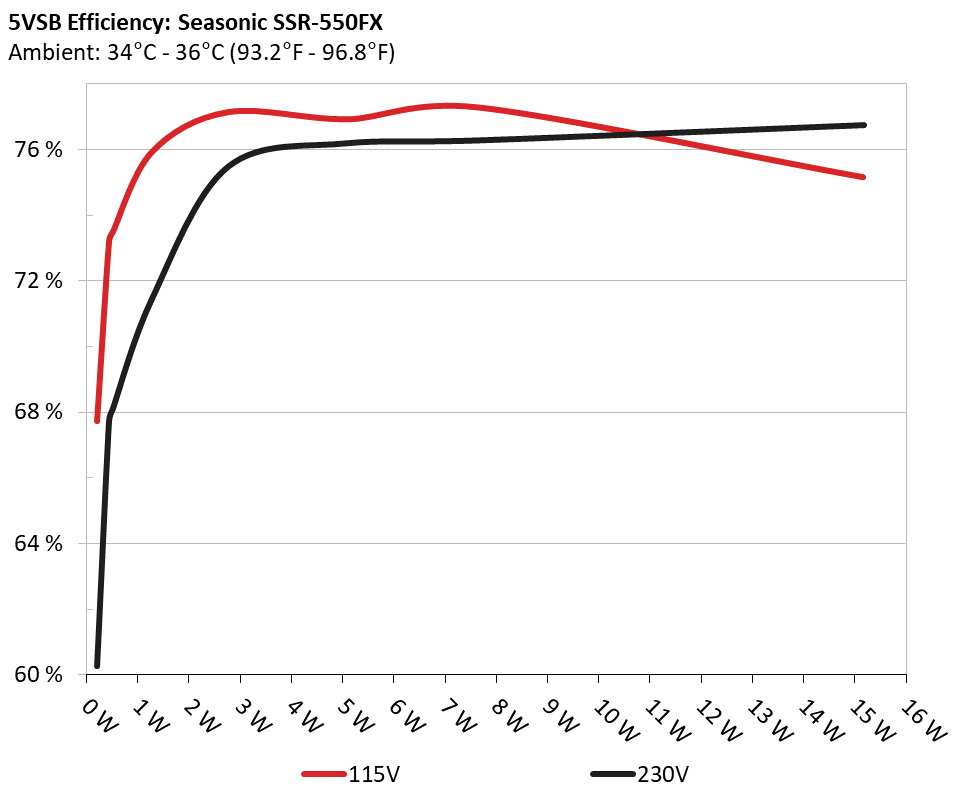 This graph depicts the efficiency levels of the 5VSB rail with 115V and 230V input.