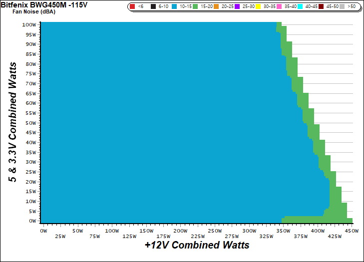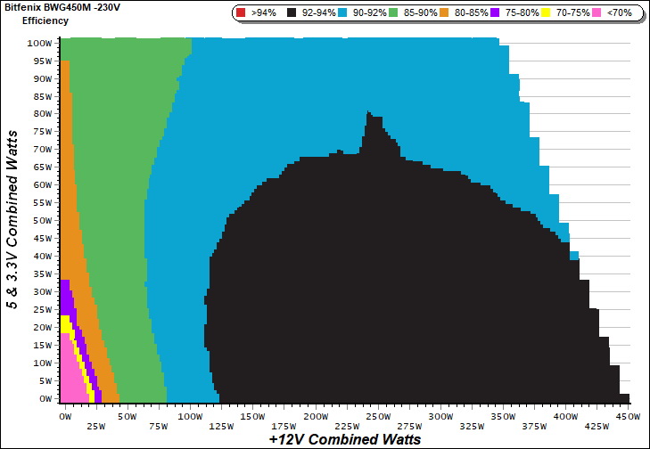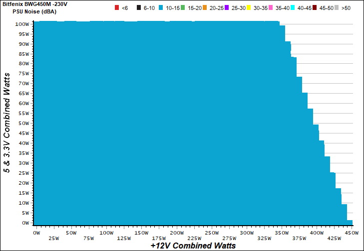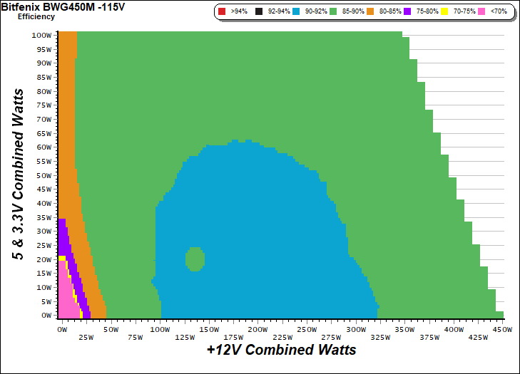 This graph depicts the PSU`s efficiency throughout its entire operational range. For the generation of the efficiency and noise graphs we set our loaders to auto mode through our custom-made software before trying thousands of possible load combinations.