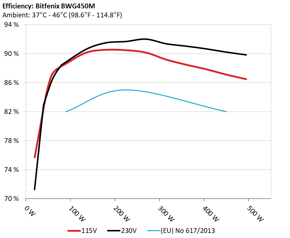 The PSU`s efficiency under high ambient temperatures with 115V and 230V input. For this graph the results of the 10-110% load regulation table are used.