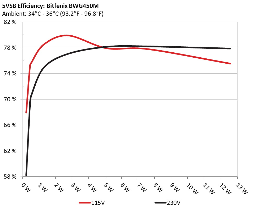 This graph depicts the efficiency levels of the 5VSB rail with 115V and 230V input.