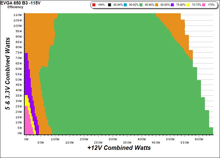 This graph depicts the PSU`s efficiency throughout its entire operational range. For the generation of the efficiency and noise graphs we set our loaders to auto mode through our custom-made software before trying thousands of possible load combinations.