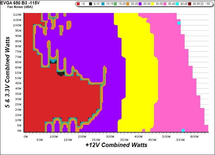 The PSU`s noise in its entire operational range and under 30-32 °C ambient is depicted in this graph. The X axis represents the load on the +12V rail(s) while the Y axis is the load on the minor rails.