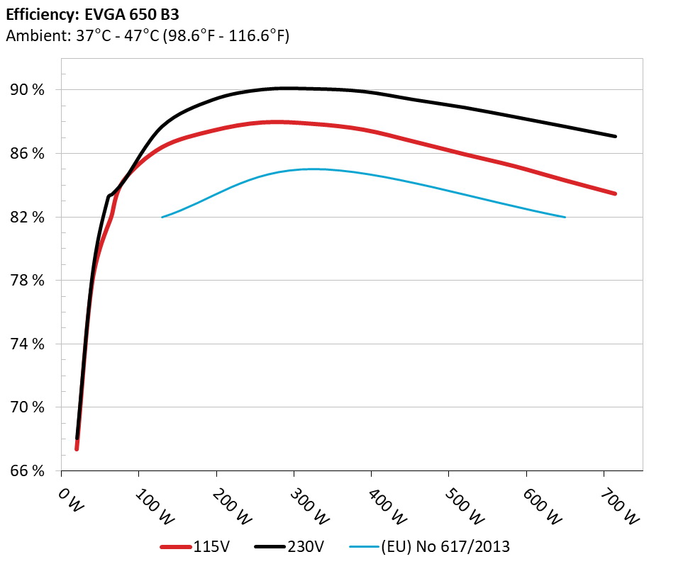 The PSU`s efficiency under high ambient temperatures with 115V and 230V input. For this graph the results of the 10-110% load regulation table are used.