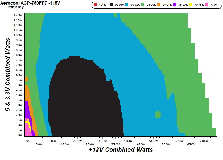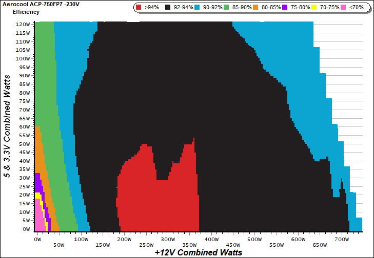 This graph depicts the PSU`s efficiency throughout its entire operational range. For the generation of the efficiency and noise graphs we set our loaders to auto mode through our custom-made software before trying thousands of possible load combinations.