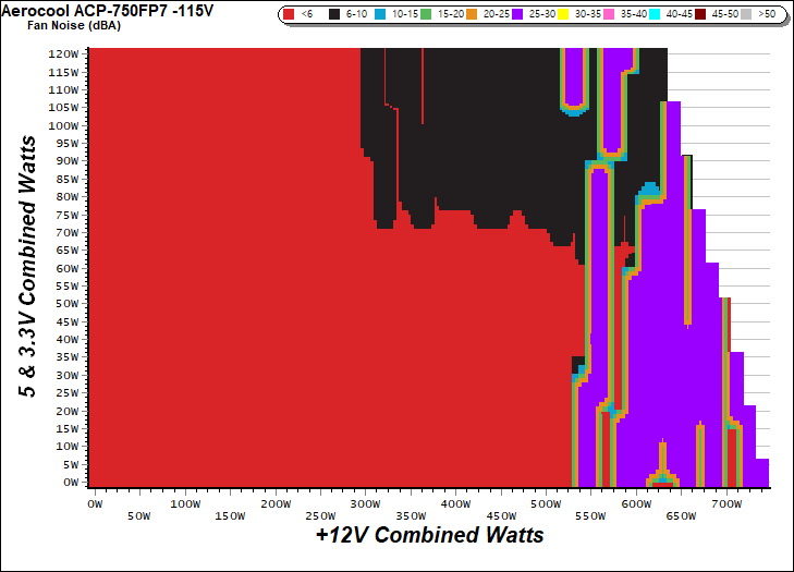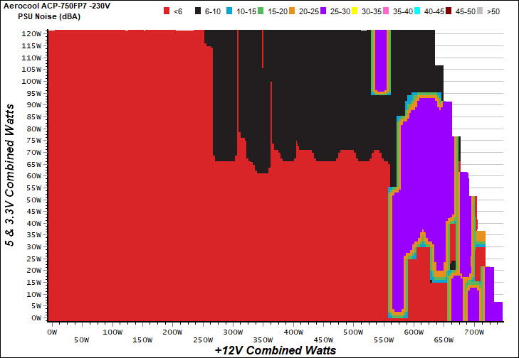 The PSU`s noise in its entire operational range and under 30-32 °C ambient is depicted in this graph. The X axis represents the load on the +12V rail(s) while the Y axis is the load on the minor rails.