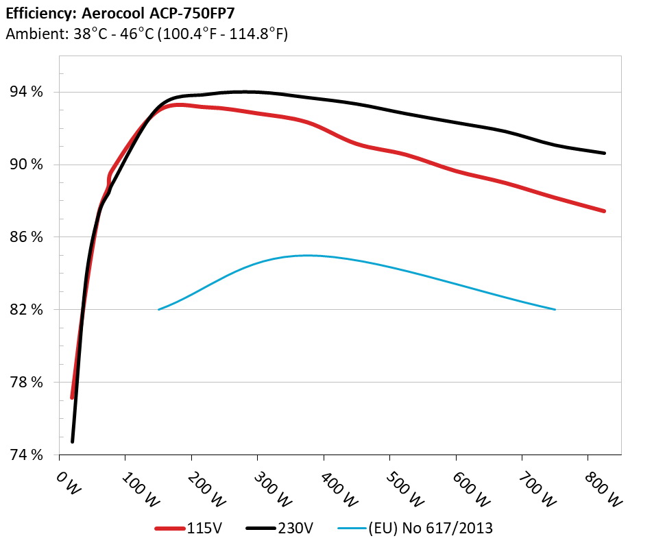 The PSU`s efficiency under high ambient temperatures with 115V and 230V input. For this graph the results of the 10-110% load regulation table are used.
