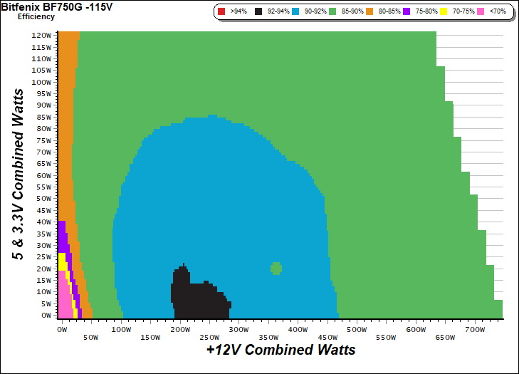 This graph depicts the PSU`s efficiency throughout its entire operational range. For the generation of the efficiency and noise graphs we set our loaders to auto mode through our custom-made software before trying thousands of possible load combinations.