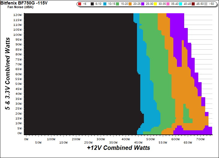 The PSU`s noise in its entire operational range and under 30-32 °C ambient is depicted in this graph. The X axis represents the load on the +12V rail(s) while the Y axis is the load on the minor rails.