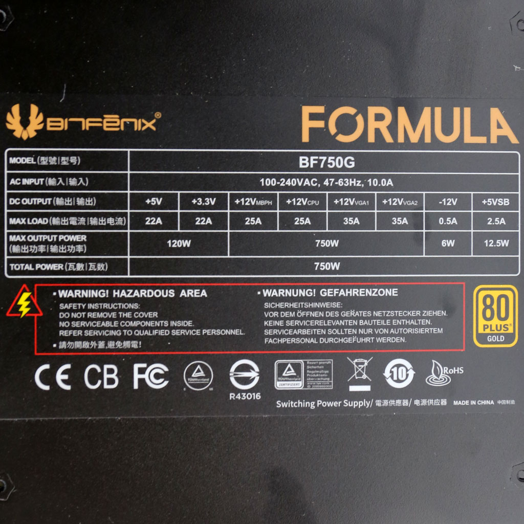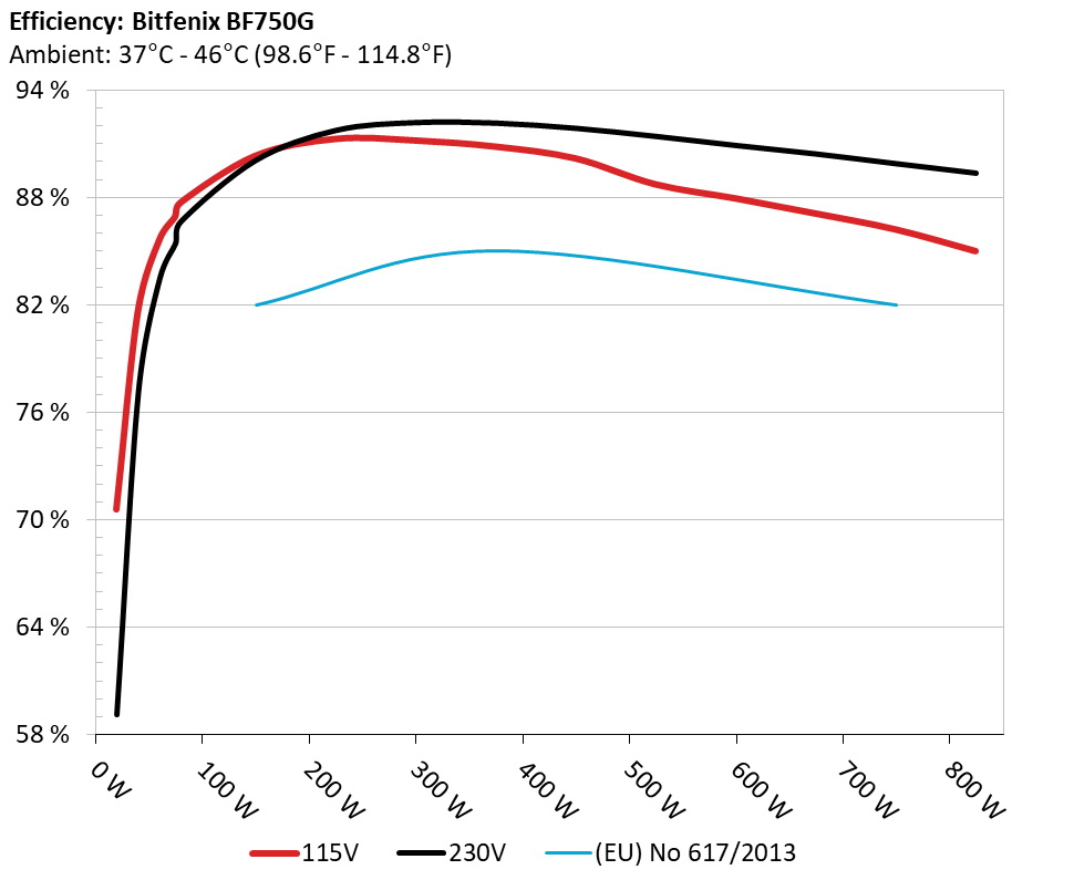 The PSU`s efficiency under high ambient temperatures with 115V and 230V input. For this graph the results of the 10-110% load regulation table are used.