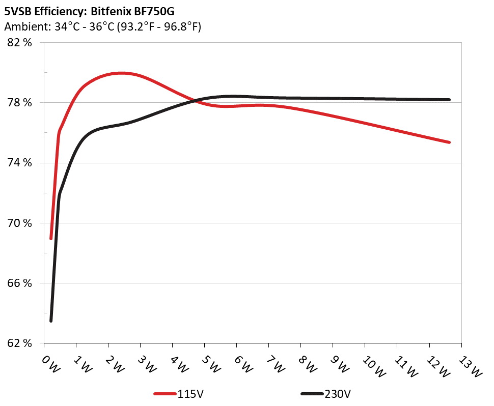 This graph depicts the efficiency levels of the 5VSB rail with 115V and 230V input.