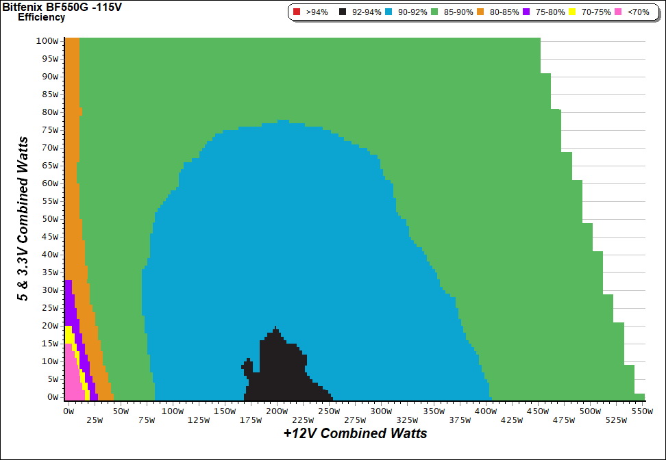 This graph depicts the PSU`s efficiency throughout its entire operational range. For the generation of the efficiency and noise graphs we set our loaders to auto mode through our custom-made software before trying thousands of possible load combinations.