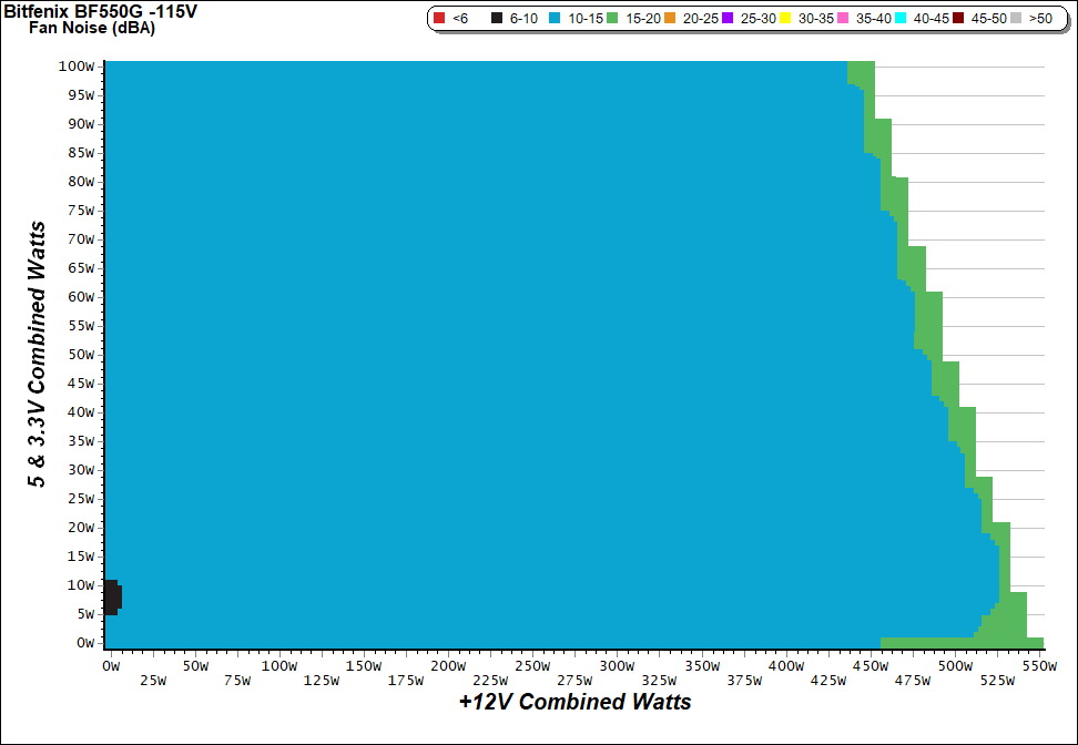 The PSU`s noise in its entire operational range and under 30-32 °C ambient is depicted in this graph. The X axis represents the load on the +12V rail(s) while the Y axis is the load on the minor rails.