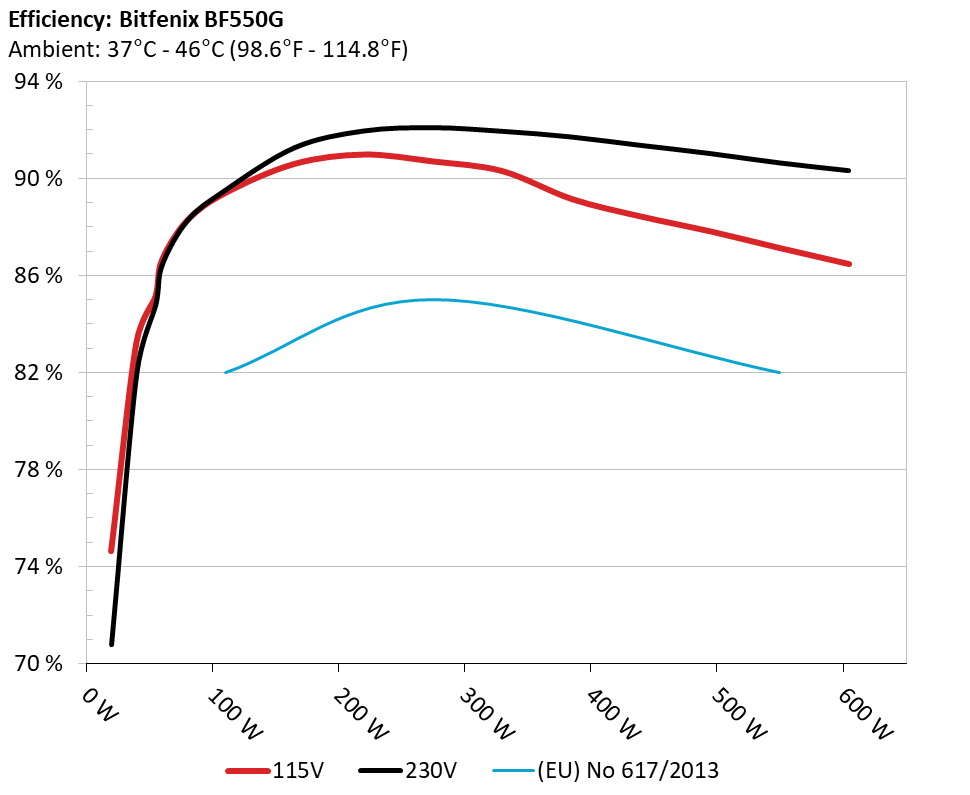 The PSU`s efficiency under high ambient temperatures with 115V and 230V input. For this graph the results of the 10-110% load regulation table are used.