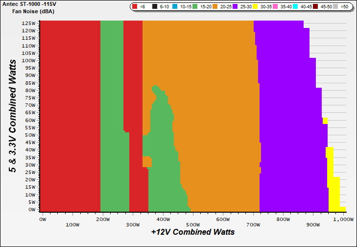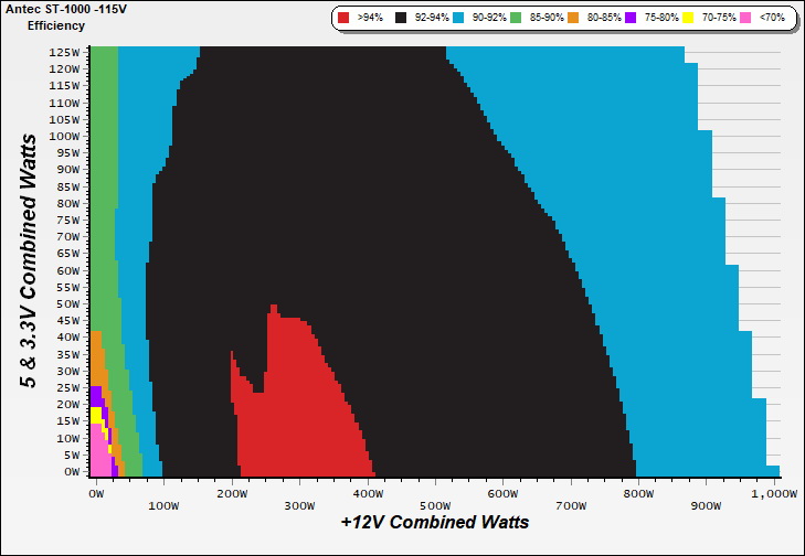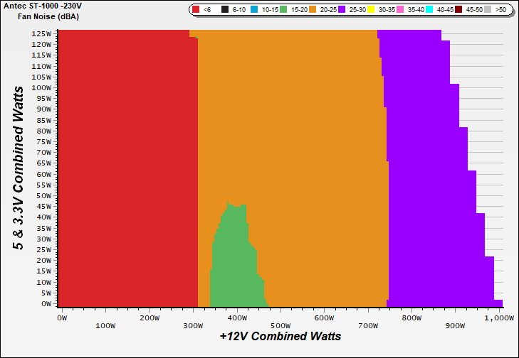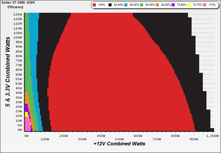 This graph depicts the PSU`s efficiency throughout its entire operational range. For the generation of the efficiency and noise graphs we set our loaders to auto mode through our custom-made software before trying thousands of possible load combinations