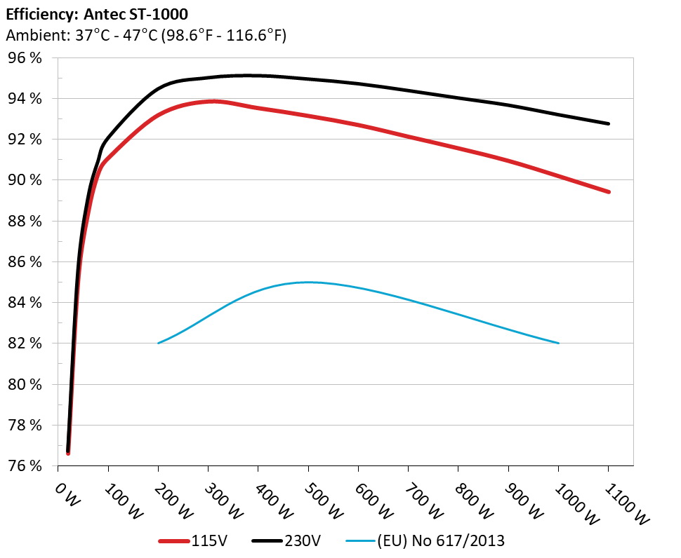 The PSU`s efficiency under high ambient temperatures with 115V and 230V input. For this graph the results of the 10-110% load regulation table are used