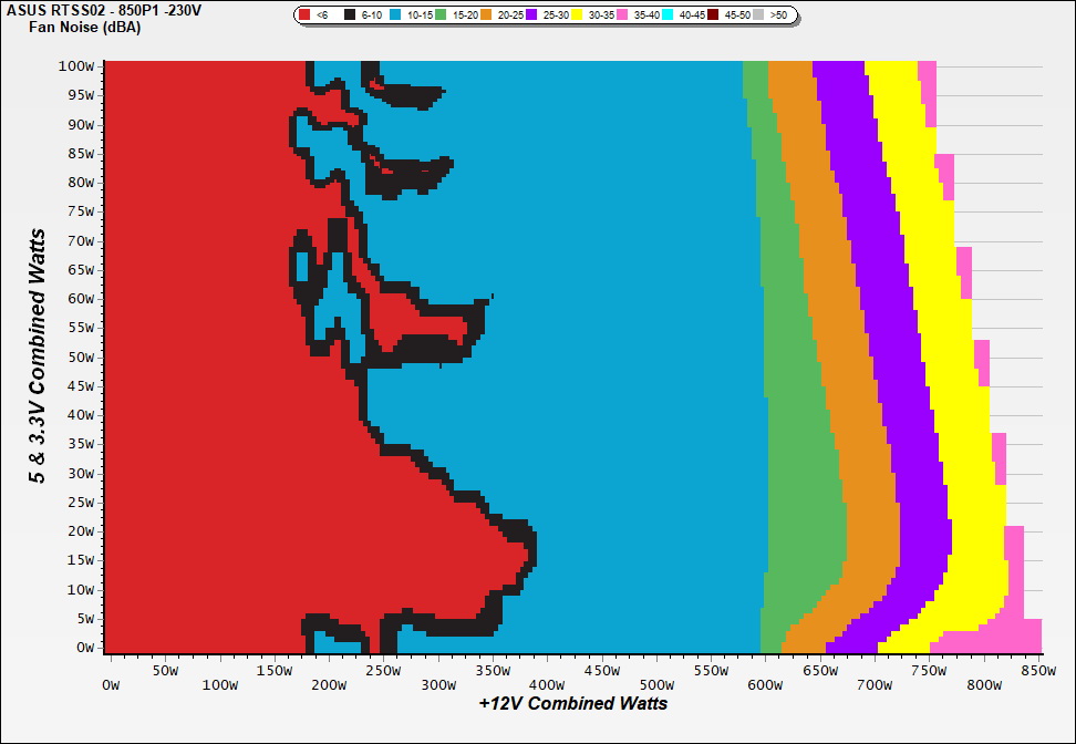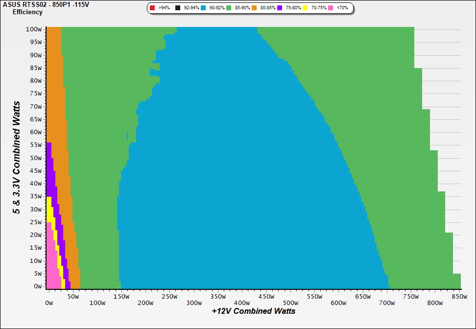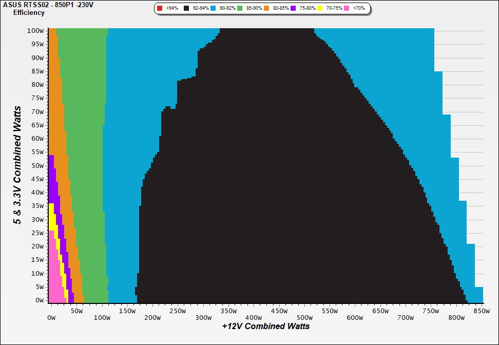 This graph depicts the PSU`s efficiency throughout its entire operational range. For the generation of the efficiency and noise graphs we set our loaders to auto mode through our custom-made software before trying thousands of possible load combinations