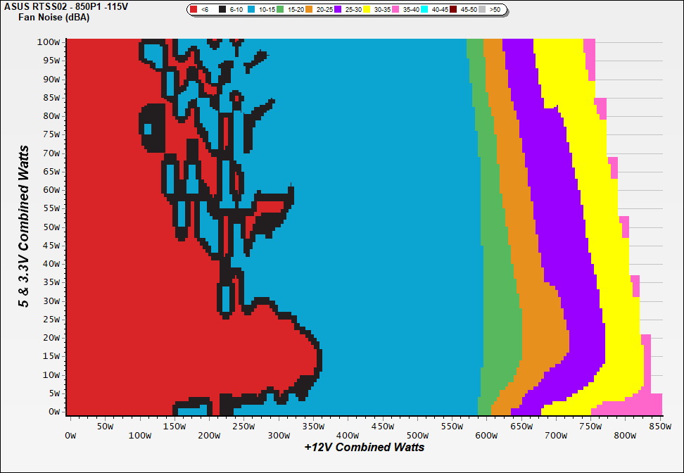 The PSU`s noise in its entire operational range and under 30-32 °C ambient is depicted in this graph. The X axis represents the load on the +12V rail(s) while the Y axis is the load on the minor rails
