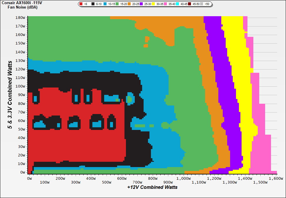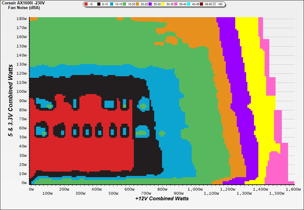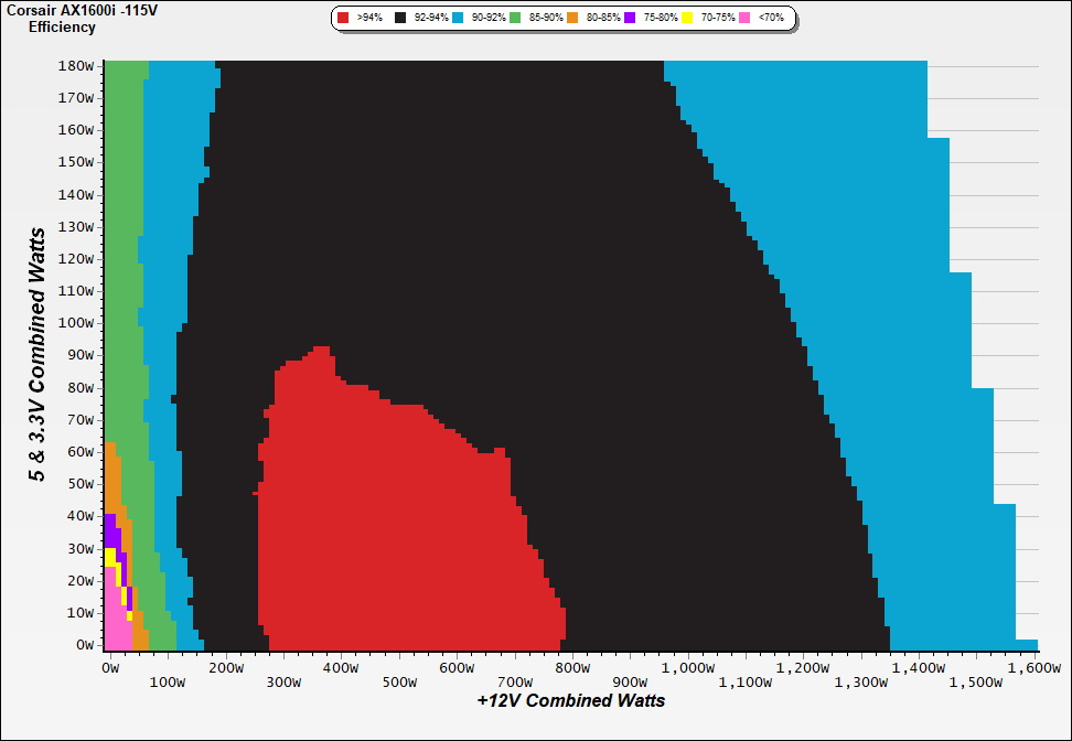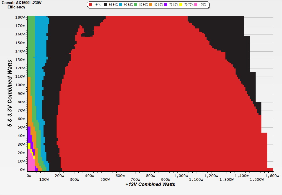 This graph depicts the PSU`s efficiency throughout its entire operational range. For the generation of the efficiency and noise graphs we set our loaders to auto mode through our custom-made software before trying thousands of possible load combinations