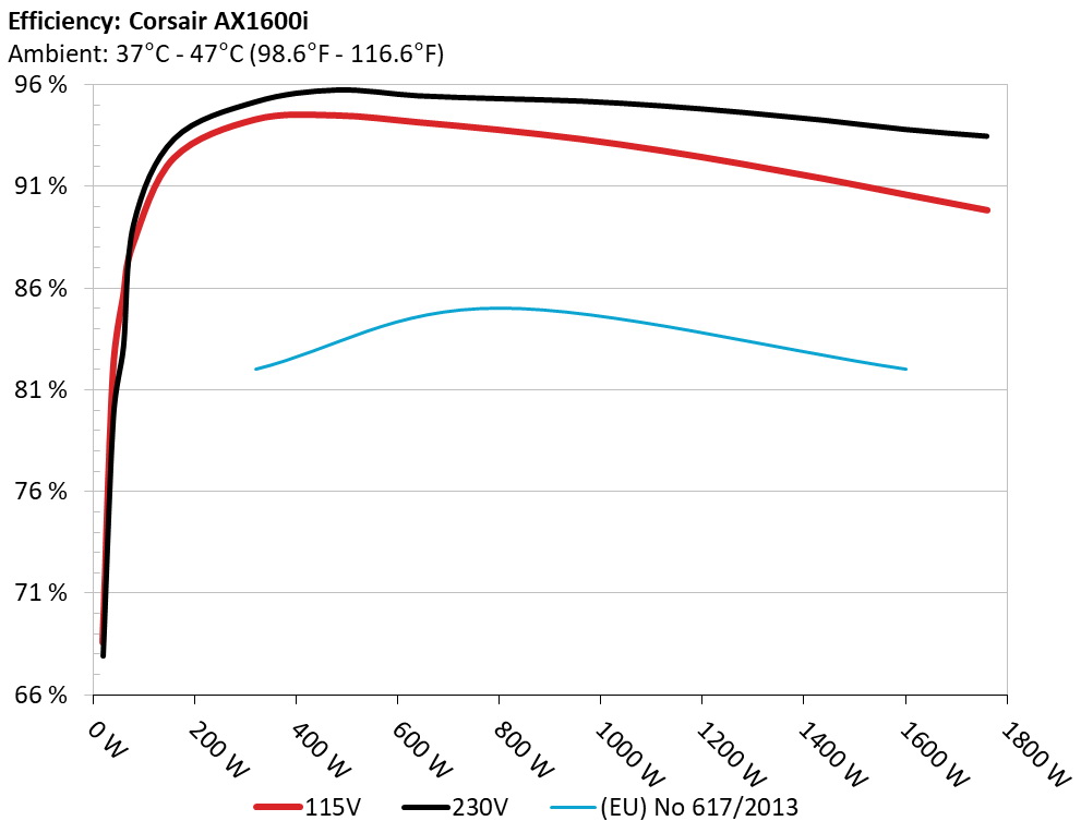 The PSU`s efficiency under high ambient temperatures with 115V and 230V input. For this graph the results of the 10-110% load regulation table are used