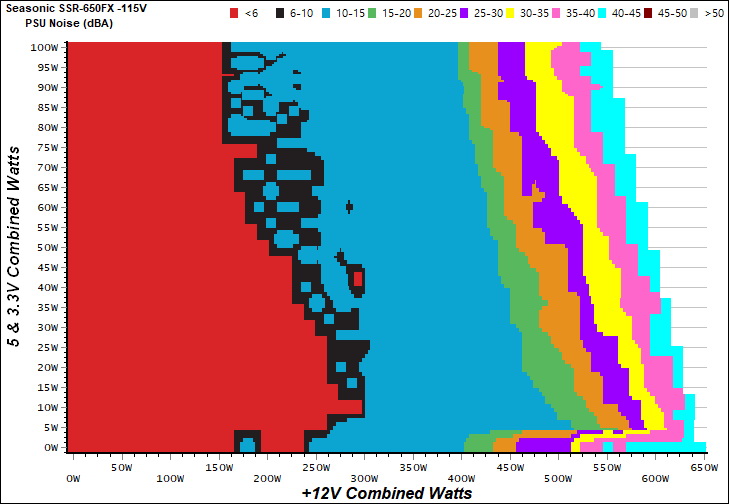 The PSU`s noise in its entire operational range and under 30-32 °C ambient is depicted in this graph. The X axis represents the load on the +12V rail(s) while the Y axis is the load on the minor rails.