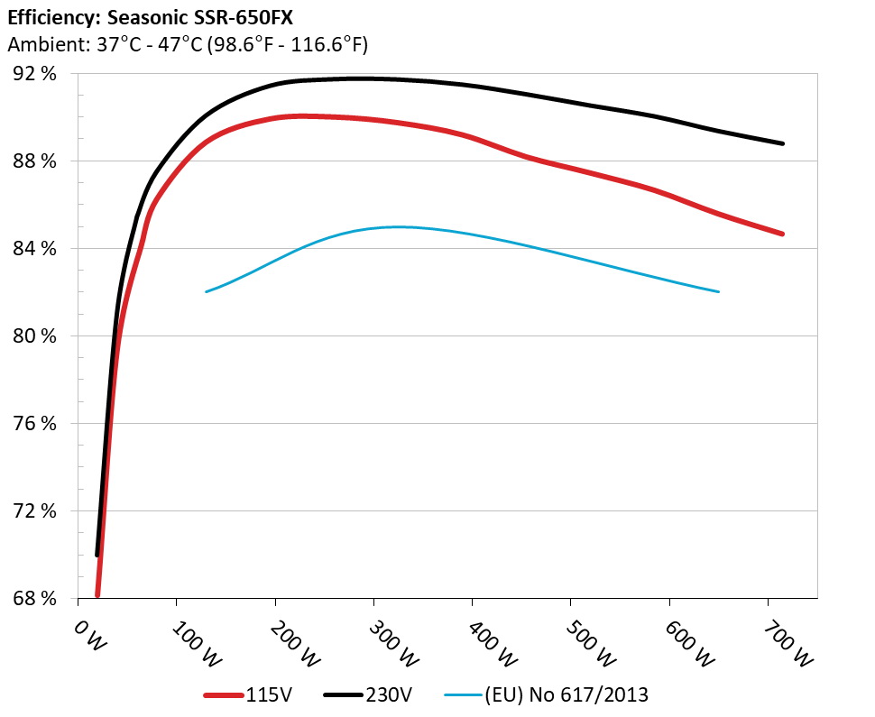 The PSU`s efficiency under high ambient temperatures with 115V and 230V input. For this graph the results of the 10-110% load regulation table are used.