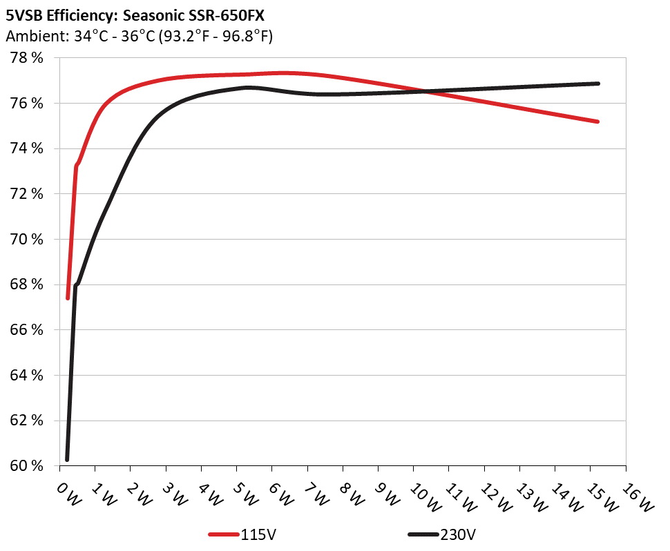 This graph depicts the efficiency levels of the 5VSB rail with 115V and 230V input.