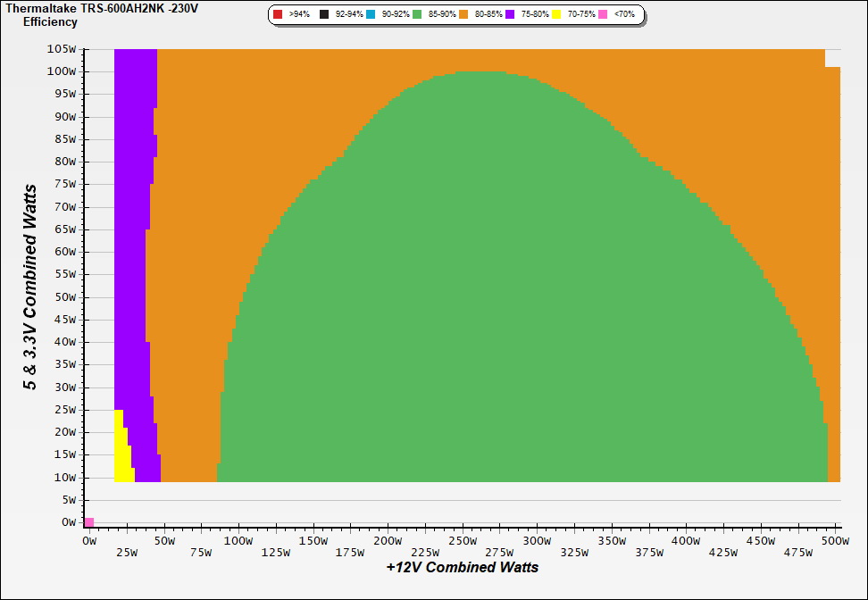 This graph depicts the PSU`s efficiency throughout its entire operational range. For the generation of the efficiency and noise graphs we set our loaders to auto mode through our custom-made software before trying thousands of possible load combinations