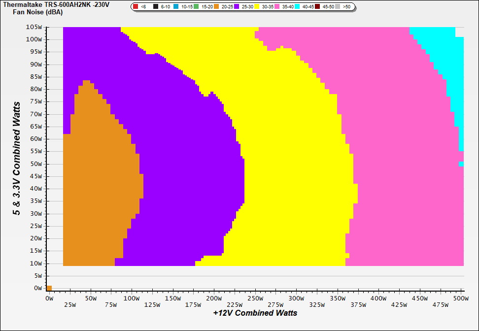 The PSU`s noise in its entire operational range and under 30-32 °C ambient is depicted in this graph. The X axis represents the load on the +12V rail(s) while the Y axis is the load on the minor rails