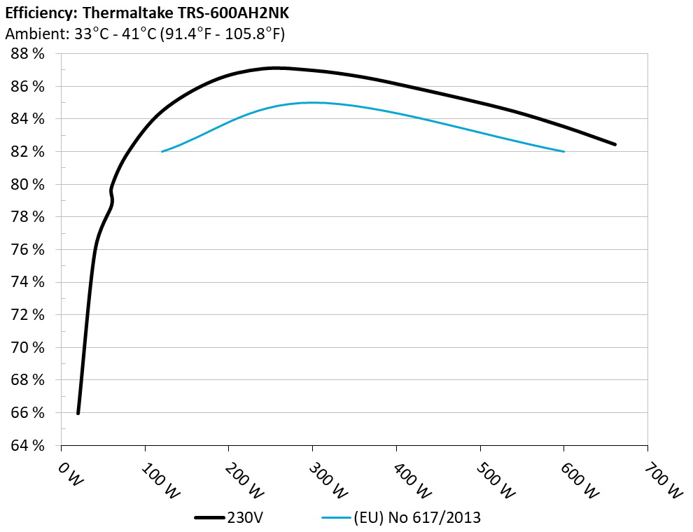 The PSU`s efficiency under high ambient temperatures with 115V and 230V input. For this graph the results of the 10-110% load regulation table are used