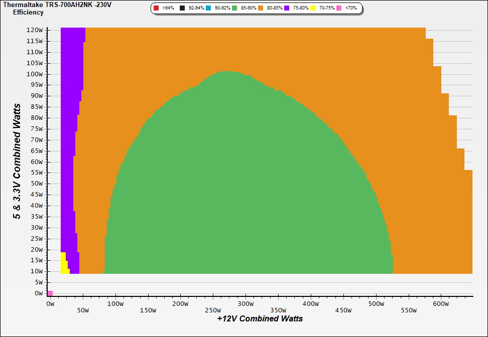 This graph depicts the PSU`s efficiency throughout its entire operational range. For the generation of the efficiency and noise graphs we set our loaders to auto mode through our custom-made software before trying thousands of possible load combinations